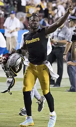 In the season-opener against the Cleveland Browns, Brown recorded 182 receiving yards on 11 receptions as the Steelers won on the road by a score of 21–18.[171] His 182 receiving yards led all NFL receivers for the season opening week.[172] In addition, he caught all 11 of his targets, which marked a career-high in terms of receptions with a 100% completion rate.[173] During a Week 4 26–9 road victory over the Baltimore Ravens, Brown became angry over not being thrown the ball by Ben Roethlisberger on an incomplete play, and was filmed throwing a Gatorade cooler and yelling at coaches.[174] During Week 11 against the Tennessee Titans, Brown made a one-handed catch adjacent to his helmet in the end zone for a touchdown. Overall, he had 10 receptions for 144 yards and three touchdowns as the Steelers won 40–17.[175][176] Brown joined John Stallworth as the only Steelers player with two career games with at least three receiving touchdowns.[177] For his performance in Week 11, Brown was named AFC Offensive Player of the Week.[178] In the next game against the Green Bay Packers, he had 169 receiving yards and two touchdowns, including two sideline receptions for 37 yards in the final 17 seconds to set up the game-winning field goal.[179] Brown became the fifth player since the 1970 merger with four games with at least 150 receiving yards in the first 12 weeks of a season.[180] Plagued with a minor toe injury,[181] in Week 14 against the Ravens, Brown finished with a season-high 213 receiving yards on 11 receptions, helping the Steelers narrowly win 39–38 and clinch the AFC North title.[182] His 213-yard performance marked the second time in his career with at least 200 receiving yards in a single game.[183] During Week 15 against the New England Patriots, Brown left the game with a left calf injury, and was taken to the hospital. Shortly after the Steelers' 27–24 loss to the AFC East-clinching Patriots, it was revealed that Brown's left calf was partially torn, meaning that he would not play for the rest of the regular season, but would return during the playoffs.[184] He returned in the Divisional Round of the playoffs, recording seven catches for 132 yards and two touchdowns as the Steelers lost to the Jacksonville Jaguars by a score of 45–42.[185]