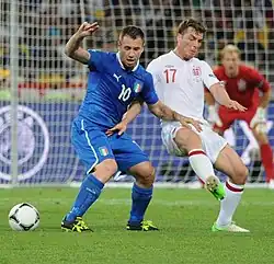 Cassano played in all six of Italy's matches and scored one goal against the Republic of Ireland during Euro 2012,[108] where the Italians reached the final, losing 4–0 against Spain.[109] In the semi-final against Germany, Cassano set up Mario Balotelli's first goal of the match.[110] Cassano wore the number 10 shirt for Italy throughout the tournament.[111] In July 2012, he was fined by UEFA for making a homophobic comment at a press conference during Euro 2012. At the conference, when asked if he thought there were any homosexual players in the Italian team, he replied, "I hope there are none." He later issued a statement saying he had been misinterpreted.[112]