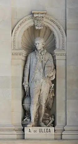 The street in which Ulloa was born in Seville, originally named Clavel, was renamed Ulloa in 1845 and Almirante Ulloa ("Admiral Ulloa") in 1875.[18] A large bust of Ulloa, together of those of members of the French Geodesic Mission to the Equator, adorns the Ciudad Mitad del Mundo monument in the outskirts of Quito. In 2013, the University of Seville opened a new Learning Resource Centre named after Antonio de Ulloa.[19][20] In 2016 the Spanish Postal Service issued a stamp to mark the 300th anniversary of Ulloa's birth.[21]