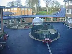 Antrim Grammar School's quad area with the Sports Centre in the background