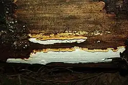 Antrodia are effused-resupinate, that is, they lie stretched out on the growing surface with the hymenium exposed on the outer side, but turned out at the edges to form brackets. When present, these brackets are typically white or pale brown. The pores on the surface of the hymenium may be round or angular. The context is white or pale. All species cause brown-rot. Typically, basidiospores are thin-walled, cylindrical, and narrowly ellipsoidal or fusiform in shape.[5] Most species grow on the wood of coniferous trees, except for A. albida, which grows on the dead wood of deciduous trees.[6]