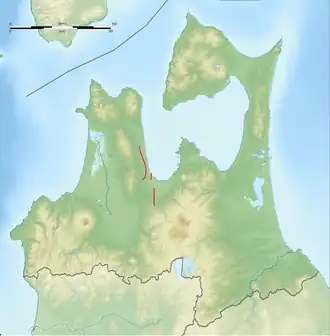 ![]() Aomori Prefecture with the Aomori Bay West Coast Fault Zone shown in red | |
