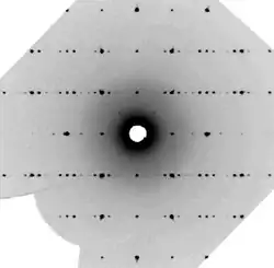 The X-ray diffraction patterns of aperiodic crystals contain two sets of peaks, which include "main reflections" and "satellite reflections".[1] Main reflections are usually stronger in intensity and span a lattice defined by three-dimensional reciprocal lattice vectors. Satellite reflections are weaker in intensity and are known as "lattice ghosts". These reflections do not correspond to any lattice points in physical space and cannot be indexed with the original three vectors.