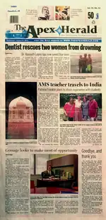 The final edition of the Apex Herald, Vol. 55, No. 32, was published on August 8, 2013.[2] The four front-page articles were about Apex dentist Dr. Kenneth Leahy saving two drowning swimmers; Apex Middle School teacher Patricia Franklin traveling to Mumbai, India for cultural exchange training; the appointment of former Apex Mayor pro tem Bryan Gossage as Deputy Secretary of the North Carolina Department of Commerce; and a farewell message from the newspaper.