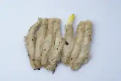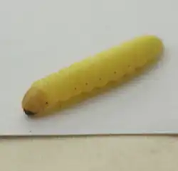 Larvae are typically yellow in color and have a length of 22–30 mm. They begin by spinning a silk around themselves for protection and then proceed to feed on the surrounding environment including the pollen and honey within the nest, stored food, and meconia. The larvae tend to tunnel throughout the nest looking for food all the while destroying large amounts of the nest around them.[1][3]