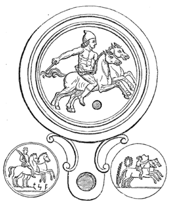 As early as the Homeric times, we find the description of a man, who keeps four horses abreast at full gallop, and leaps from one to another, amidst a crowd of admiring spectators.[2] Eustathius on Homer's Iliad, Lib. IV, assures us that riders might have up to six horses all abreast.[3] In the games of the Roman circus, this sport was also very popular. The Roman desultor generally rode only two horses at the same time, sitting on them without a saddle, and vaulting upon either of them at his pleasure.[4] He wore a hat or cap made of felt. The taste for these exercises was carried to so great an extent, that young men of the highest rank not only drove bigae and quadrigae in the circus, but exhibited these feats of horsemanship.[5]