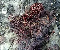 Apophlaea is a genus of thalloid algae that is endemic to New Zealand.[1] Species in the genus are found in the high intertidal zone on New Zealand's coasts.[2][3] Specimens can reach around 15 cm in size. The thalli take a crustose form, but also contain upright, branching frond-like protrusions that reach 5–8 cm in height.[4][5] Secondary pit connections and secondary pit connectionsare present in the organisms. Apophlaea reproduces by means of conceptacles; it produces tetraspores.