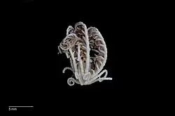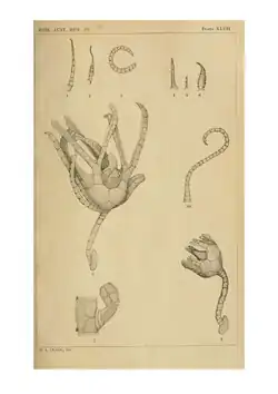 Plate XLVII shows three types of pinnules: first, second and distal pinnules (Figs 4–6), and pentacrinoid larvae (Figs 7–9) from youngest to oldest. Fig 10 shows a cirrus.[2] In the earliest free-swimming stage, the arms are about 7 mm long and have about nine pinnules on each side.[2] This is a small species of crinoid with arms up to 3 cm (1.2 in) long. All Clark's large specimens carried pentacrinoid larvae attached to their pinnules.[2]