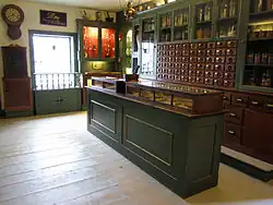 4°22′35.94″N 73°13′52.62″W / 4.3766500°N 73.2312833°W The Apothecary Shop is a building at the Shelburne Museum in Shelburne, Vermont, that exhibits objects salvaged from New England pharmacies that were closing in the early decades of the 20th century. The main room contains dried herbs, spices, drugs, and labeled glass apothecary bottles from the nineteenth century, as well as early patent medicines, medical equipment, cosmetics, and a collection of barbers' razors. The compounding room, with its brick hearth, copper distilleries, and percolators, replicates an illustration found in Edward Parrish's 1871 Treatise on Pharmacy.[1]