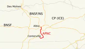 The Appanoose County Community Railroad (reporting mark APNC) was based out of Centerville, Iowa. It was a shortline running to the community of Albia, Iowa, where it distributed cars from Centerville to be put on the BNSF Railway's trains.