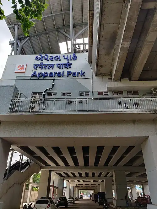 Apparel Park is an elevated metro station on the East-West Corridor of the Blue Line of Ahmedabad Metro in Ahmedabad, India. It was opened to the public on 4 March 2019. This metro station will be the depot station for the metro trains running in this Blue Line.[1][2][3][4]