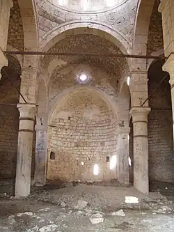 It contains the Church of the Holy Precursor (Surb Karapet), also called Church of Saint John (Surb Hovhannes),[4][14][3] a cruciform building measuring 17 m × 12.2 m (56 ft × 40 ft)[4] with four free-standing columns, a low drum, and topped with a flattened dome.[14] Built between 1851 and 1873 on the site of an earlier church, it conforms to the plan of post-Byzantine Greek churches.[15][14][3] The church's sole entrance is from the west.[3] Its interior was originally covered in plaster, while the floor was paved with large stone slabs.[3] A small barrel vaulted building (martyrium)[4] is adjoined to the church's south wall, accessed solely from inside the church.[3] Within the enclosure are the prelacy building and dwellings.[4][3][13]