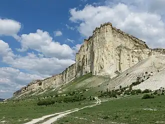 Aq Qaya (Crimean Tatar: Aq Qaya, Ukrainian: Ак-Кая, Russian: Белая скала) — is a rock in Crimea, situated near the village of Belaya Skala/Ak-Kaya of the Bilohirsk Raion.[1][2][3]
