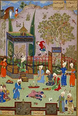 - ^ "The picture is also rewarding as an accurate description of the costumes, noblemen, and setting at Shah Tahmasp's court" in Welch 1976, p. 76