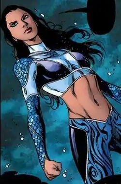 Lorena Marquez is a resident of San Diego who gains Atlantean powers alongside many of its residents after scientist Anton Geist experiments on them. After Geist destroys much of San Diego, killing thousands, Lorena helps the survivors rebuild underwater.[10] Lorena later joins the Teen Titans, where she befriends Static and flirts with Blue Beetle and Superboy.[11] Lorena does not appear following The New 52.[12]