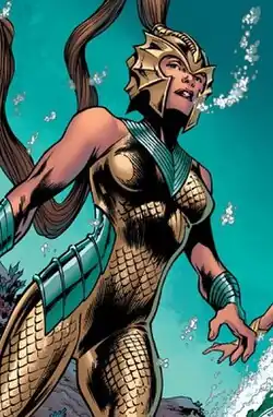 In more recent continuities, Tula retains most of her original abilities typically seen of an Atlantean as her previous iterations (breathing underwater, superhuman strength, swimming at extreme speeds, enhanced senses and reflexes) though portrayed at a greater degree and unlike Atlantean, is trained to be able to survive outside the surface for extended periods of time similarly to a human. She is also considered a adept Atlantean warrior, skilled with many weaponry possessed by Atlantis[1] and has considerable skill as a special forces commander, her skills including espionage, military tactics, and military training.[13] Tula is also proficient in politics, having enough experience and leadership qualities to act as a regent of Atlantis under Aquaman's administration.[14] Due to her status as regent, Tula possessed special governmental privileges during and even after her tenure.[15]