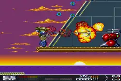 By defeating enemies, players gain XP in order to increase their current experience level, health and attack output.[6][7] Controlling the mech is done with a directional pad, which moves the player character left and right, as well as both an attack and a jump button. Pushing the jump button while in mid-air activates a grappling hook that can allow the mech to pull forward, swing from the ceiling of any platform or jump into the latched platform.[6][7] Pressing both action buttons and down at the same time allows access to the inventory screen to choose a weapon. Once a stage is completed, the players' current progress is automatically saved. If the mech sustains too much enemy damage, the players lose a live and once all lives are lost, the game is over.