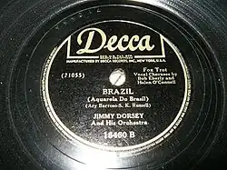 In 2009, the Recording Academy added the 1942 recording of "Brazil (Aquarela do Brasil)" by Jimmy Dorsey & His Orchestra, released as Decca 18460B, to the Grammy Hall of Fame.[12][13] Jimmy Dorsey was the first to record the song on July 14, 1942, and release it with the English lyrics by Bob Russell sung by Bob Eberly and Helen O'Connell.[14]