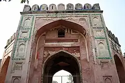 This building contains arched cells against its enclosure walls. Presently, the cells are in ruins. The northern gate is the only structure of the building which is intact. The gate measures 12.2 metres (40 ft) in height and is made of quartzite with red sandstone and is inlaid by marble. The octagonal shaped gate chamber was crowned by a dome at the time of its construction, but since then the dome has collapsed. A balcony window is present over the arch of the main gateway and is supported by six brackets. On each side of the gateway at the same level, more balcony windows crowned by a pyramidal dome are present. The domes are covered with yellow and blue tiles.[6]