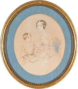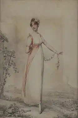 In 1808 Thomas Gilliland described her as an "excellent dancer, and pretty little woman" with a small but elegant figure and regular and pretty features.[5] The actress Sarah Siddons was less complimentary, describing Menage in a 1804 letter as "a naughty little dancing Girl at Drury Lane".[5] On 11 August 1804 at St James's Church in Piccadilly[7][11][12] she married Michael William Sharp, a successful portrait painter and a former student of Sir William Beechey. Sharp was distantly related to Mrs. Siddons, who said the forthcoming marriage "will afflict his poor Mother and Sister."[13] As Mrs. Sharp her stage career continued until at least the 1811–1812 season.[1][8]