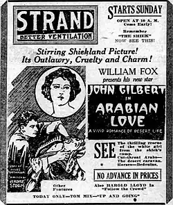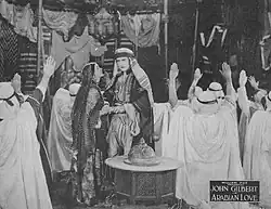 Arabian Love was made to profit on the success of The Sheik (1921), a film which romanticizes sheiks and Latin lovers.[3] Most films John Gilbert made at Fox Film Corporation flopped, but Arabian Love became a great success. Gilbert was praised for his portrayal of a sheik, but the actor himself loathed it and made sure he later would not appear again in that sort of character.[4] Barbara La Marr was praised by the critics too, with the film magazine Moving Picture World stating that "the forlorn lovesickness of the sheikâs daughter [is] unusually effective".[5]