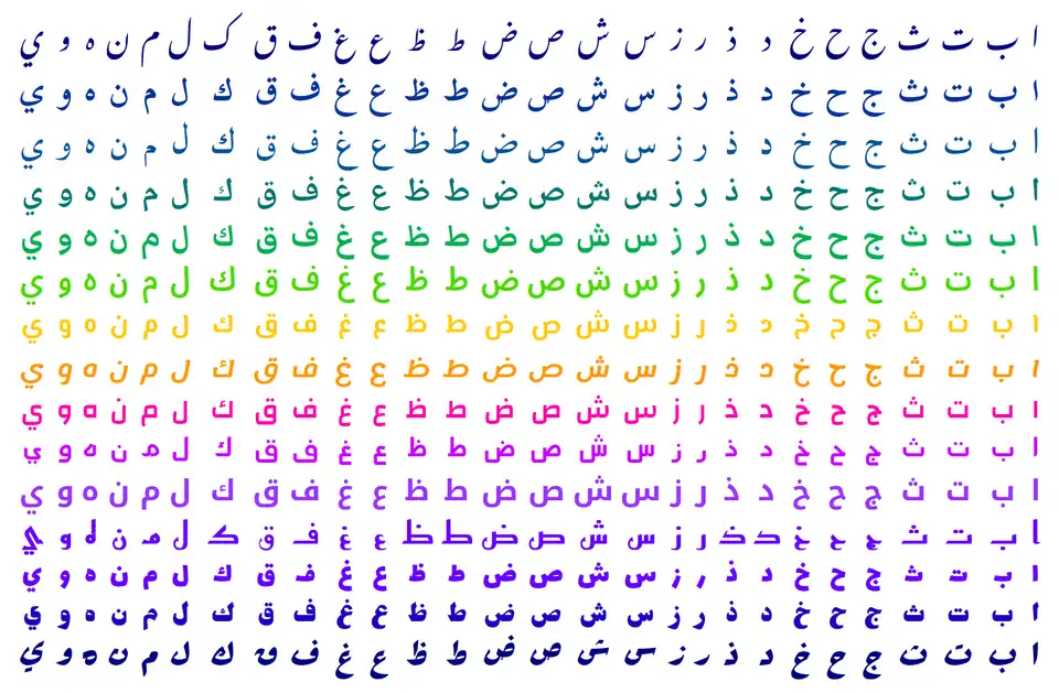 | ا | ب | ج | د | ه | و | ز | ح | ط | ي | ك | ل | م | ن | س | ع | ف | ص | ق | ر | ش | ت | ث | خ | ذ | ض | ظ | غ |