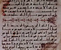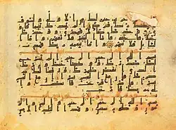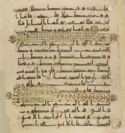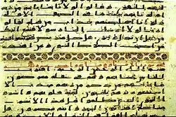 Written in the territory of modern Iraq in the Kufic script. Now kept in the Hast Imam library, in Tashkent, Uzbekistan.[42][43] Its verse endings are marked by small panels of diagonals lines; the tenth verse is marked with a square medallion illuminated in blue, green, red and manganese with a stellar design.[44]