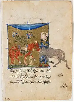 The Maqamat manuscripts provide an opportunity to employ an iconography directly inspired by daily life in the Arab towns of the time.[62] Love stories are present in Arabic literature, but only two illustrated manuscripts are known, the most famous of which is Hadith Bayad wa Riyad. The other particularity of the manuscript is being one of the rare illustrated works produced in the Maghreb or Al-Andalus at that time.[63]