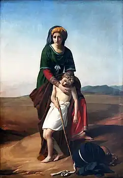 The Quran mentions that Ibrahim (Abraham) and his wife Hajar (Hagar) bore a prophetic child named Ishmael, who was gifted by God a favor above other nations.[122] Ibrahim and Ishmael built the Kaaba in Mecca, which was originally constructed by Adam.[123] According to the Samaritan book Asaṭīr:[124]: 262 "And after the death of Abraham, Ishmael reigned twenty-seven years; And all the children of Nebaot ruled for one year in the lifetime of Ishmael; And for thirty years after his death from the river of Egypt to the river Euphrates; and they built Mecca."[125] The Targum Onkelos annotates (Genesis 25:16), describing the extent of their settlements: The Ishmaelites lived from Hindekaia (India) to Chalutsa (possibly in Arabia), by the side of Mizraim (Egypt), and from the area around Arthur (Assyria) up towards the north. This description suggests that the Ishmaelites were a widely dispersed group with a presence across a significant portion of the ancient Near East.[126][127]