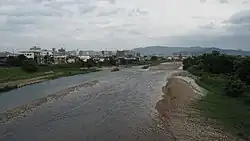 ![]() Looking southeast over the Arakawa River in Fukushima City. Fukushima Station is visible in the distance. | |