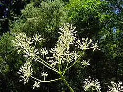 It is a deciduous, herbaceous, perennial plant growing to a height of 2–3 m on stems which are thick but not woody. The stems bear large green pinnately compound or tri-pinnately compound leaves 1–2 m long and 1 m broad, the leaflets 15–30 cm long and 7–15 cm broad. The leaflets are arranged opposite with an odd terminal leaflet. The greenish white flowers are produced in large compound racemes of umbels 30–45 cm in diameter at the stem apex; each flower is 2–3 mm in diameter, and matures to small (3–5 mm) dark purple or black fruit, each berry containing 3–5 seeds.[2]