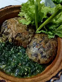 In Egypt stuffed grape leaves are called mahshi waraq enab (محشي ورق عنب),[21] The filling typically consists of short-grain rice combined with fresh herbs such as parsley, dill, and mint, seasoned with spices like allspice and cumin.[22] In some Egyptian households, ground beef or lamb is incorporated into the stuffing to enhance the flavor and provide a heartier meal.[23] Once rolled, the grape leaves are neatly arranged in a pot lined with tomato slices or onion rings to prevent sticking and to infuse additional flavor.[24] They are then cooked slowly in a broth until tender and infused with the aromatic flavors of the filling.[23] This dish is often served warm or at room temperature.[25]