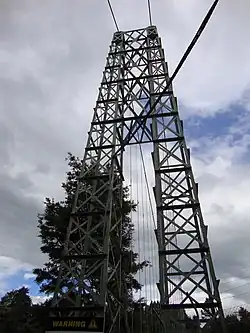 The bridge was designed by David Rowell & Co. from Westminster, London. The structure is likely to have been shipped prefabricated from England, and was erected by the British contractors for the Arapuni dam and power station project, Armstrong Whitworth.[1] It is one of the longest suspension footbridges in the country.[2] The bridge has a span of 152.4 metres (500 ft)[2] and is 8 metres (26 ft) higher when measured from true left (i.e. the left side when looking downriver) to true right.[3] It has a high steel lattice tower on the true left. On the true right, the bridge footing is cut into the side of the river bank and the foundation for the suspension cables is built on top of the cliff.[2]