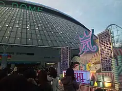 The group's success in 2007 sparked renewed public interest. In February, Arashi released their first single of the year, "Step and Go", which debuted at the top of the Oricon weekly chart for having sold 324,223 copies, making it as the group's first single to exceed 300,000 copies sold in the first week since "Sunrise Nippon/Horizon" in 2000.[18][56] The same month, it was announced that the group would be doing a concert tour of the five major domes in Tokyo, Nagoya, Osaka, Fukuoka, and Sapporo.[57] The tour, titled Arashi Marks 2008 Dream-A-Live, consisted of ten performances, from May 16 in Osaka to July 6 in Sapporo.[57][58] The only other Johnny's artists who have done a five dome tour were SMAP and KinKi Kids.[57] The tour also coincided with their eighth studio album, Dream "A" Live, which was reported to be a hit with male buyers by Oricon despite the fact that most releases by Johnny's artists are geared towards female teens and young adults.[59] In the midst of the tour, Arashi released their twenty-second single "One Love", the theme song for the last production of the Hana Yori Dango trilogy. Like "Step and Go", the single sold over 300,000 copies in its first week and charted at number-one of the weekly singles chart.[60]