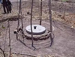 An arborloo is a simple type of composting toilet in which feces are collected in a shallow pit and a fruit tree is later planted in the fertile soil of the full pit. Arborloos have: a pit like a pit latrine but less deep; a concrete, ferrocement or other strong floor; a superstructure (toilet house or outhouse) to provide privacy; and possibly a ring beam to protect the pit from collapsing.[1] The pit should remain well above the water table in the soil, so as to not contaminate groundwater.