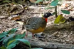 The Hainan partridge is 26–28 cm (10–11 in) long. The male weighs about 300 g (11 oz), and the female weighs about 237 g (8.4 oz).[4] The head is blackish, and there is a white patch on the ear coverts[5] and a whitish supercilium. The crown and nape are dark brown, with black mottles. The upperparts are olive-brown and have black scales. The throat and neck-sides are blackish, and there is an orange collar around the lower neck. The underparts are grey, and the central belly is buffish. The wings are greyish-brown. The beak is black, the eyes are brown, and the legs are dull reddish. The female is smaller and less bright than the male.[4]