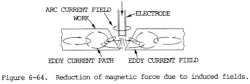 Magnetic arc blow is popularly attributed to a change in the direction of current as it flows into and through the workpiece. Magnetic arc blow is known to begin at field densities as low as 10 gauss and becomes severe at densities of, equal to or greater than, 40 gauss; it is directional and can be classified as forward or backward moving along the joint, but can occasionally occur to the sides depending on the orientation of the poles to the workpiece.