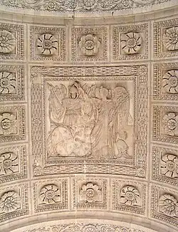 The monument is 63 feet (19 m) high, 75 feet (23 m) wide, and 24 feet (7.3 m) deep.[2] The 21 feet (6.4 m) high central arch is flanked by two smaller ones, 14 feet (4.3 m) high, and 9 feet (2.7 m) wide. Around its exterior are eight Corinthian columns of marble. These columns were recovered from the Château de Meudon, destroyed in 1804. Each column is topped by eight soldiers of the Empire. On the pediment, between the soldiers, bas-reliefs depict: