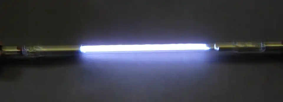 The term is now used for gas discharge lamps, which produce light by an arc between metal electrodes through a gas in a glass bulb. The common fluorescent lamp is a low-pressure mercury arc lamp.[3] The xenon arc lamp, which produces a high intensity white light, is now used in many of the applications which formerly used the carbon arc, such as movie projectors and searchlights.