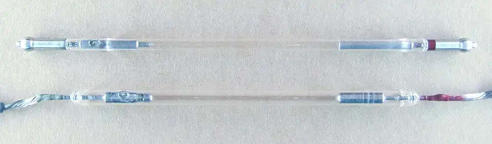 In a carbon arc lamp, the electrodes are carbon rods in free air. To ignite the lamp, the rods are touched together, thus allowing a relatively low voltage to strike the arc.[1] The rods are then slowly drawn apart, and electric current heats and maintains an arc across the gap. The tips of the carbon rods are heated and the carbon vaporizes.[1] The rods are slowly burnt away in use, and the distance between them needs to be regularly adjusted in order to maintain the arc.[1]
