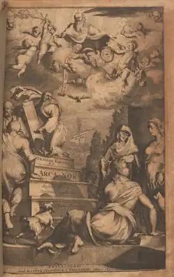 The frontispiece depicted God directing putti bearing a flaming sword, alpha and omega, above the dove the Holy Spirit. Beneath them, surrounded by lost souls struggling in the waves to reach it, the Ark is afloat on the Flood, representing the Church with Christ keeping watch in the crow's nest and the words "Extra quam non est salus" ("outside of which there is no salvation") on its sail. The foreground shows Noah and his family giving thanks for their salvation.[5]: 42