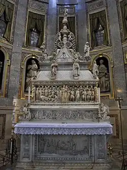 In 1532, a step was added between the sarcophagus and the altar slab by Alfonso Lombardi.