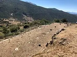Approaching the town from the south one can see tumuli on the left, chiefly composed of collections of stones as described by Pausanias. Below the acropolis is the tomb of Aristocrates and beyond are the fountains called Teneiae (Τενεῖαι) which Pausanias mentions (writing in the 2nd c. AD) as one of the most remarkable objects in the place. A little further are the Hellenistic ruins of Amilus.[24]