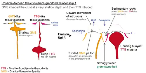 Two plutonic, igneous rock suites form 50% of Archean cratons.[6] They are (1) Tonalite-trondhjemite-granodiorite (TTG) suites and (2) Granite-Monzonite-Syenite (GMS) suites in chronological order.[6] They are magma chambers that later formed the volcanics on the Earth's surface by volcanic eruption.[30] Later they intruded the supracrustal rocks of similar age and composition in the Archean.[19] The uprising magma bodies deformed the surface greenstone belt on a cratonic scale.[5]