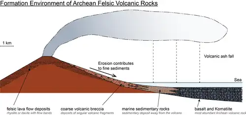 Archean felsic volcanic activities commonly occur in submarine environments.[7] The composition of Archean felsic volcanic rocks are equivalent to a spectrum between dacite and rhyolite.[5] They can be distinguished by their mineral assemblages, rock chemistry and rock layer relationship in the sequences.[7]