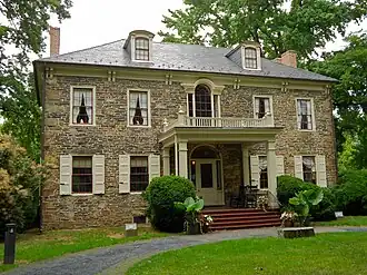 Archibald McAllister House, now officially known as Fort Hunter Mansion, is a historic home located on the Susquehanna River approximately 6 miles north of downtown Harrisburg, Dauphin County, Pennsylvania. It consists of a 2-story, 2-room stone "cabin' built in 1787, to which was added in 1814 a 2 1/2-story, five-bay wide stone dwelling in the Federal style. The mansion has an overall "T"-floorplan, with the 2+1⁄2-story 1814 addition in front and the original 1787 cabin and an attached, woodframe summer kitchen built in the mid- to late-19th century to the rear. The mansion features a front portico with Tuscan order columns above which is a Palladian window on the second floor. The entry door has a semi-circular fanlight and sidelights with thin wooden ribbing.[2]