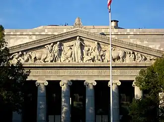Not until about 1870 did the U.S. develop the talent, the economic power, and the taste for buildings grand enough to need architectural sculpture. The Philadelphia City Hall, constructed 1871 through 1901, is recognized as the turning point,[3] because of the approximately 250 sculptures planned for the building, the large finial of William Penn, and the practical effect of Alexander Milne Calder training many assistants there.