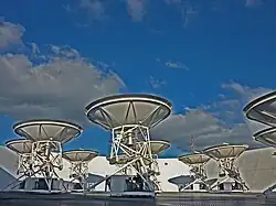 |  The 8 antennas of the Arcminute Microkelvin Imager Large Array viewed from Barton Road in 2012 | |