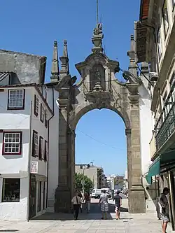 Sometime in the 17th century, Archbishop José de Bragança, ordered the reconstruction of the Porta Nova gate, to include the extension of Rococo decoration.[2] As part of its construction (1772–1773), a statue representing the city of Braga was removed from the Edifício das Arcadas and installed on the arch of the new gate (around in 1772).[1] Followed the following year by the archbishop (Gaspar de Bragança) ordering the transformation of the tower of the Porta Nova, to a triumphal arch in the Baroque style.[1]
