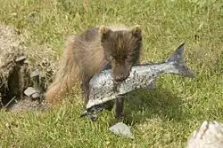 The Arctic fox preys on many small creatures such as lemmings, voles, ringed seal pups, fish, waterfowl, and seabirds. It also eats carrion, berries, seaweed, and insects and other small invertebrates. Arctic foxes form monogamous pairs during the breeding season and they stay together to raise their young in complex underground dens. Occasionally, other family members may assist in raising their young. Natural predators of the Arctic fox are golden eagles,[12] Arctic wolves, polar bears,[13] wolverines, red foxes, and grizzly bears.[14][15]